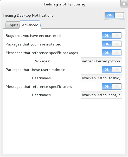 $ sudo yum -y install python-fedmsg-meta-fedora-infrastructureWith that, you can use the more fantastic options: