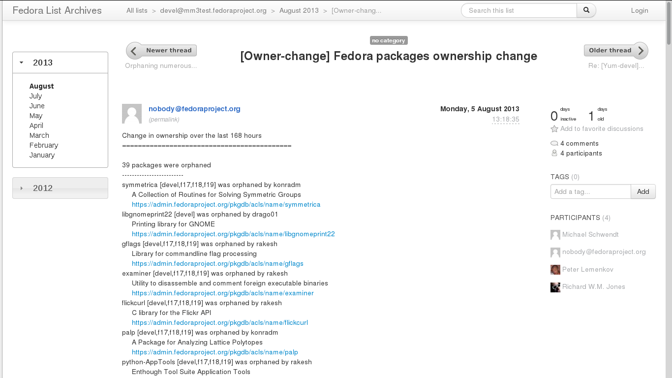 Every week, pingou's owner changes report tool emails the devel list with a report of what packages were orphaned, unorphaned and retired.