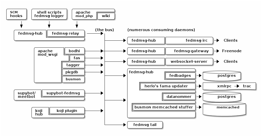 We wanted to hook all the services in Fedora Infrastructure up to send messages to one another over a message bus instead of communicating with each other in the heterogeneous, “Rube-Goldberg” ways they do now.